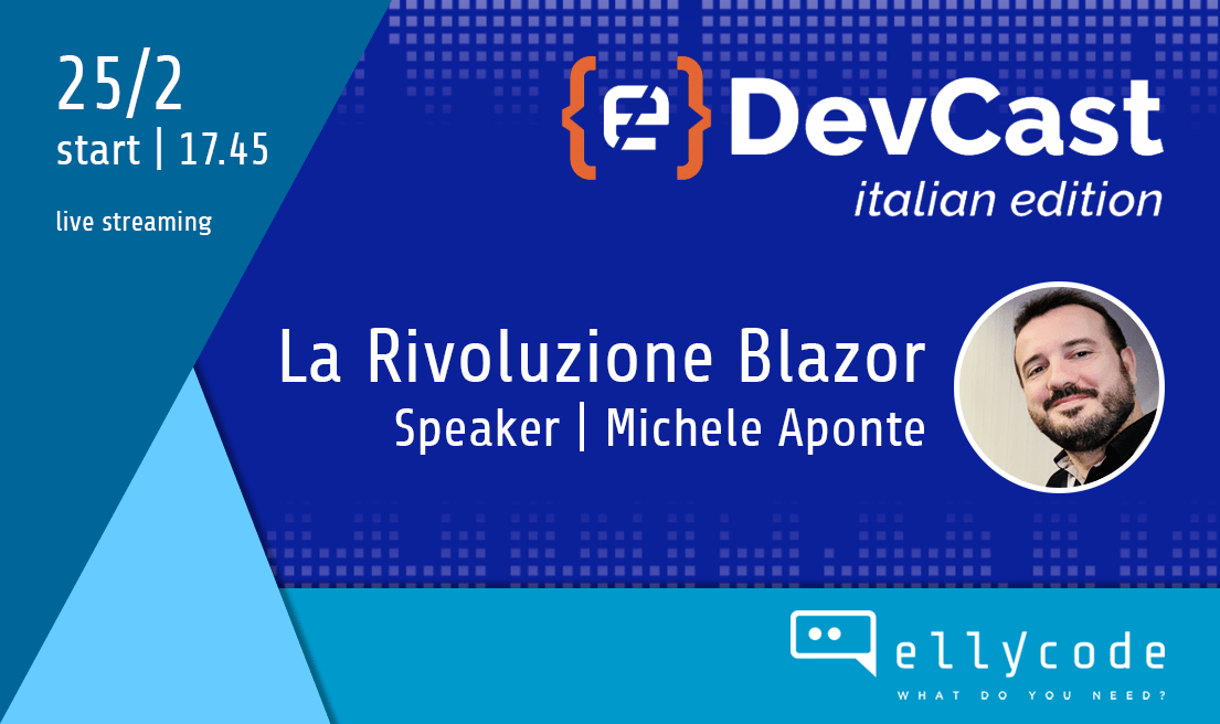 L’appuntamento è per il 25 Febbraio alle 17.00 e l’argomento è lo sviluppo front-end con Blazor, in cui Michele ci racconterà la straordinaria rivoluzione che il framework Microsoft ha generato, portando lo sviluppo .NET nel browser.